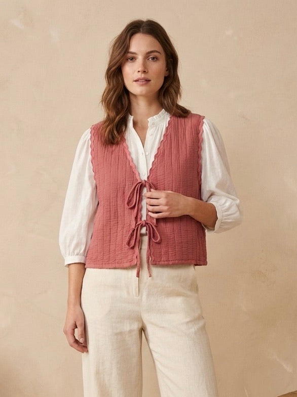 Loveday Rikrak Quilted Bow Front Gilet Antique Rose
