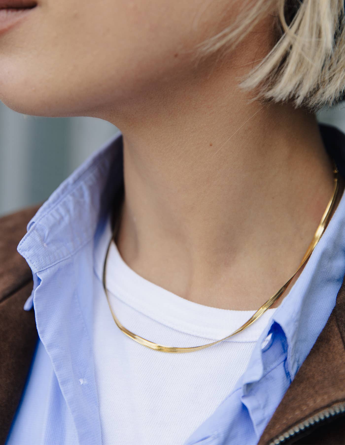 The Gold Snake Chain Choker is a style that never goes out of fashion. The choker features a sleek gold band with a clasp and an adjustable chain in the back. We think this modern design looks best just worn on its own, peeping out under a white T-shirt. Crafted from a blend of stainless steel and 18k gold, this design offers both durability and a luxurious appearance. The surface is PVD-coated to ensure a lasting, brilliant shine. The high-quality materials resist tarnishing and are hypoallergenic, making them suitable for even the most sensitive skin. Additional – Material: Tarnish-resistant 18K gold plating on stainless steel – Water-resistant finish – Hypoallergenic – Adjustable length – Premium eco box included Diameter: l 30 cm x w 0.3 cm - 5 cm Extension