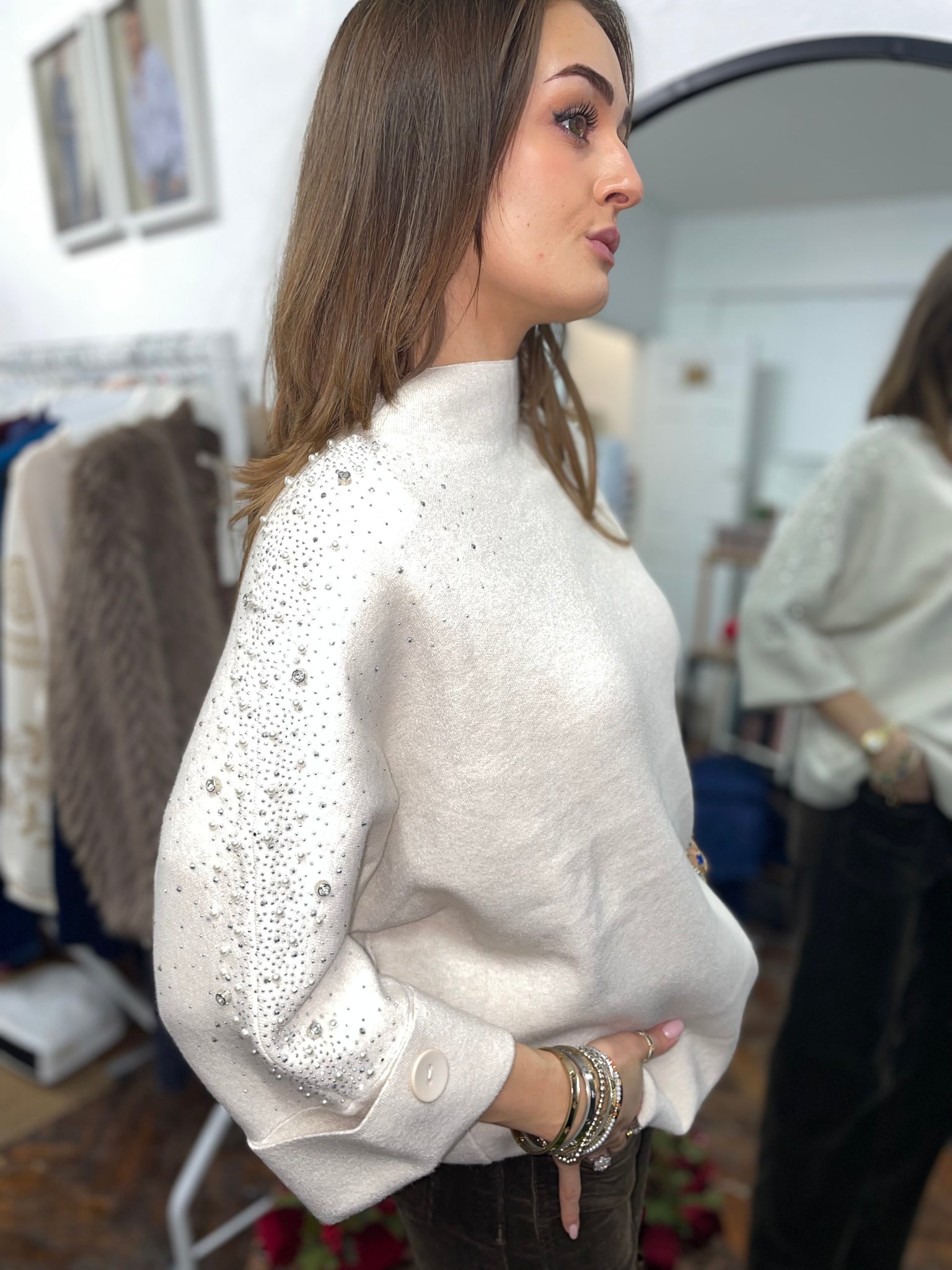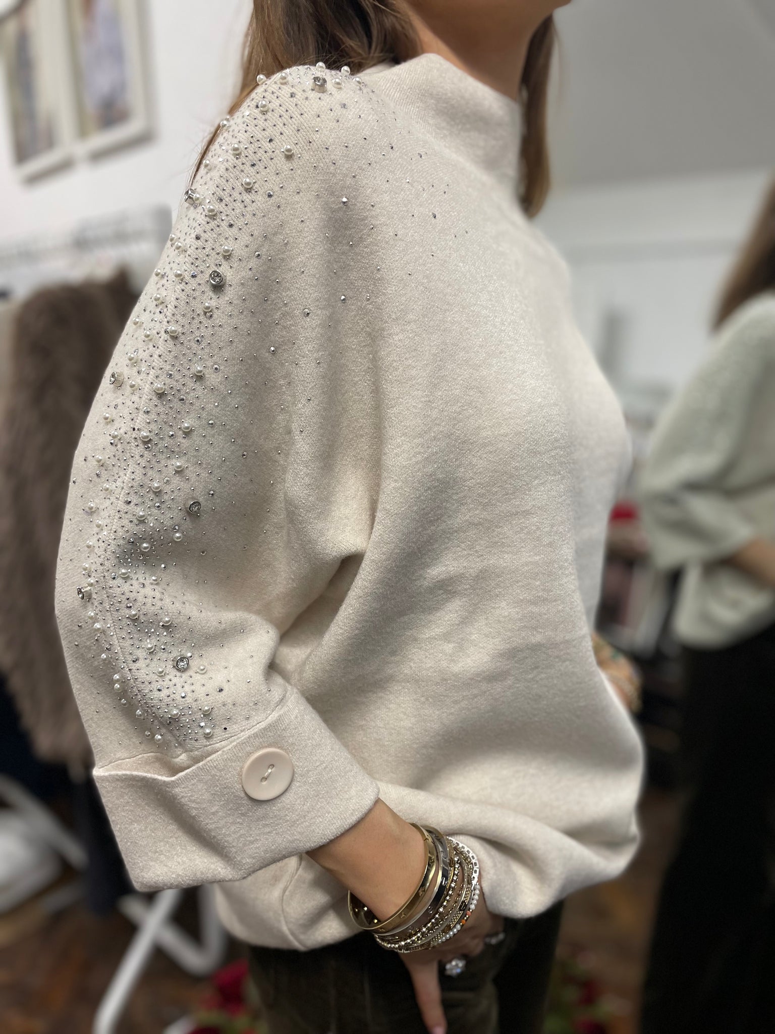 Classic turtleneck silhouette with lustrous pearl accents and softly folded sleeves.