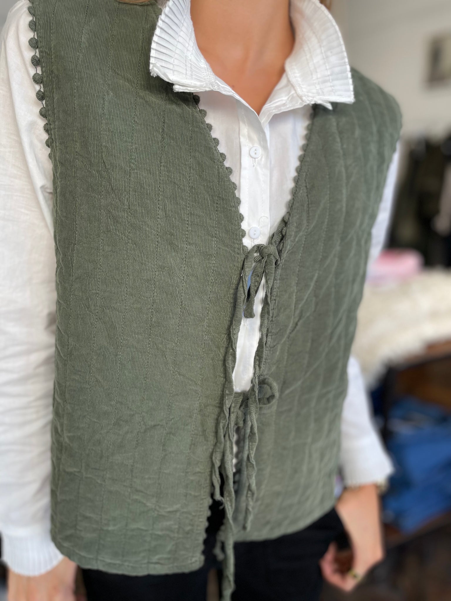 Loveday Cord Quilted Bow Front Gilet Khaki