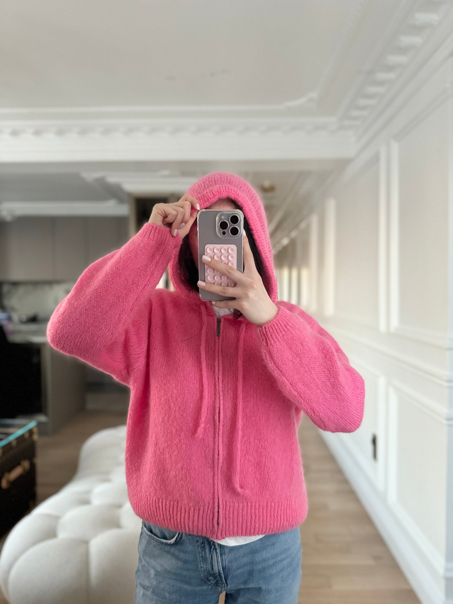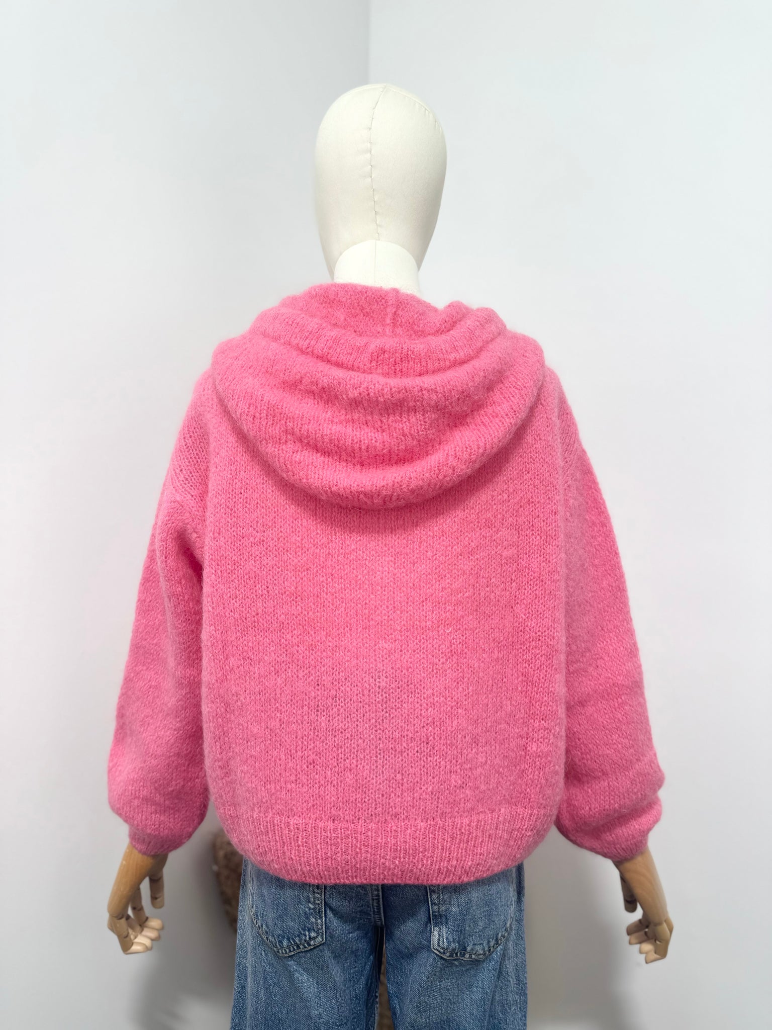 Mohair Zip Front Hoodie Cardigan Candy Pink