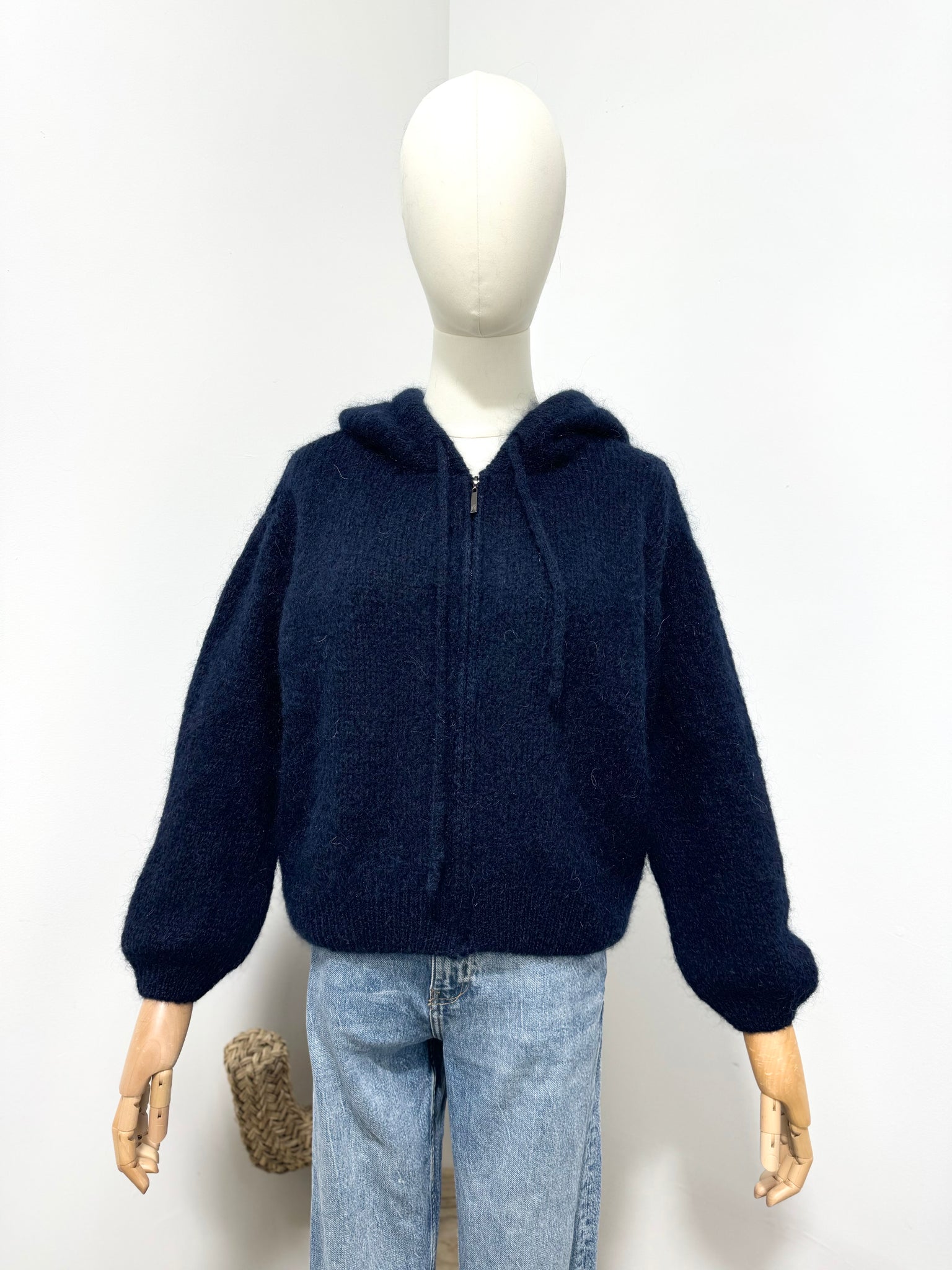 Mohair Zip Front Hoodie Cardigan Marine Navy