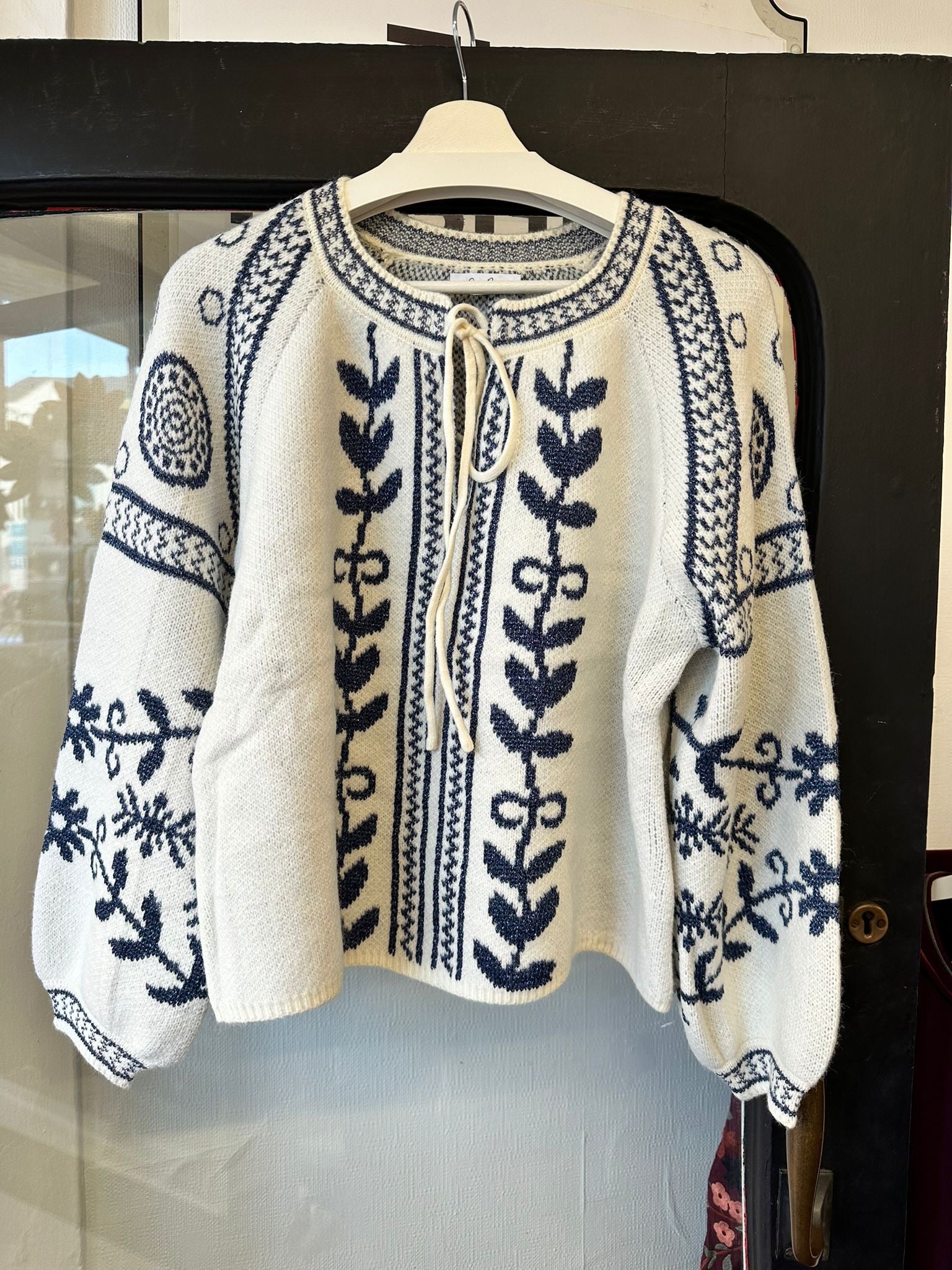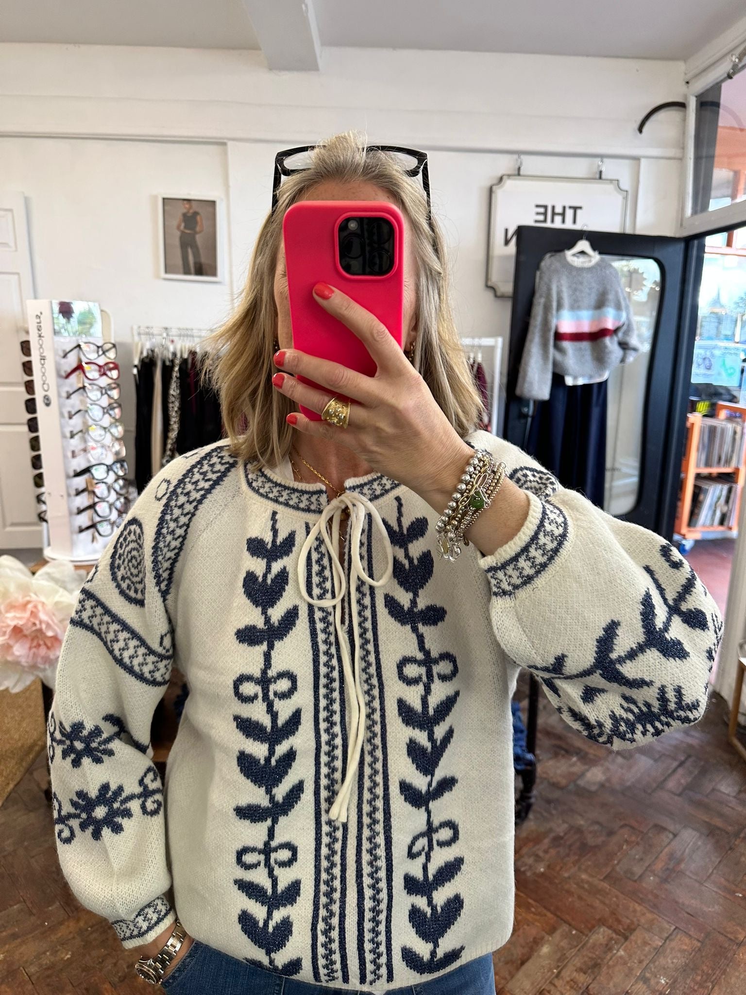 Tie neck jumper with embroidery effect knitted into the jumper in sparkle thread